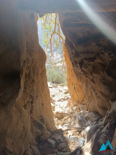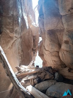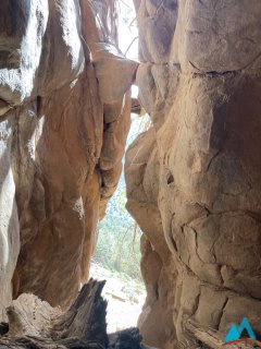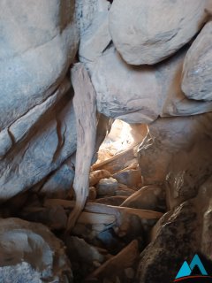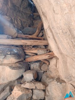 Les greniers de la partie nord de la falaise d’Aoujgal sont les plus difficiles d’accès. Pour renforcer la sécurité du site, nos ancêtres ont aménagé un tunnel vertical très étroit, d’une quarantaine de mètres mètre de hauteur, dans la paroi rocheuse de la falaise donnant accès aux étroites corniches naturelles où sont situés les magasins du grenier. Pour gravir cette cheminée, il y a une sorte d’escalier très rudimentaire fait de pierres et de morceaux de bois.
