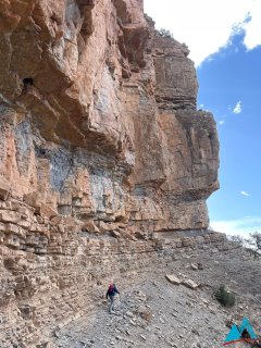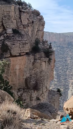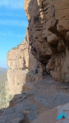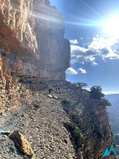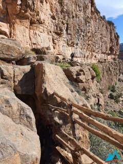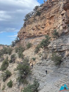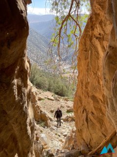 En départ de Tanger, nous rejoignons Boutferda en minibus un peu après minuit. Au programme le lendemain, la visite des greniers perchés sur la partie nord de la falaise d’Aoujgal. Le point de départ de notre parcours était le gite Tighaze à Boutferda. Il fallait faire 7 km pour attendre cette falaise, ensuite marcher 2,5 kilomètres le long de la falaise pour atteindre la cheminée qui mène à la corniche « à l’étage ». Pour visiter tous les magasins du grenier il faut faire un autre aller-retour de 3 km.