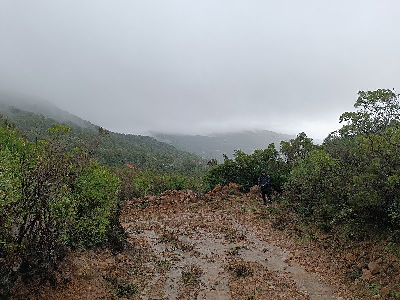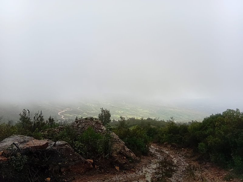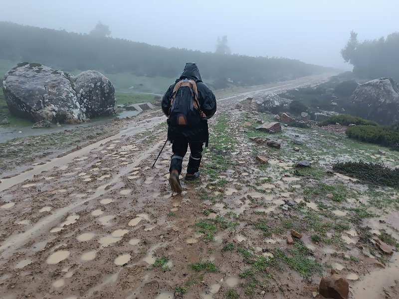 Le départ est donné tôt le matin depuis le centre de Bghaghza. La pluie s’est rapidement transformée en un véritable déluge. Dès les premières pentes qui mènent vers le Jbel Selkha, la terre rouge de Bghaghza se transforme en une boue collante, testant immédiatement l’adhérence de nos chaussures.