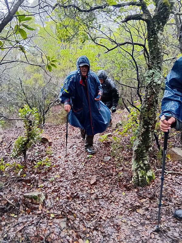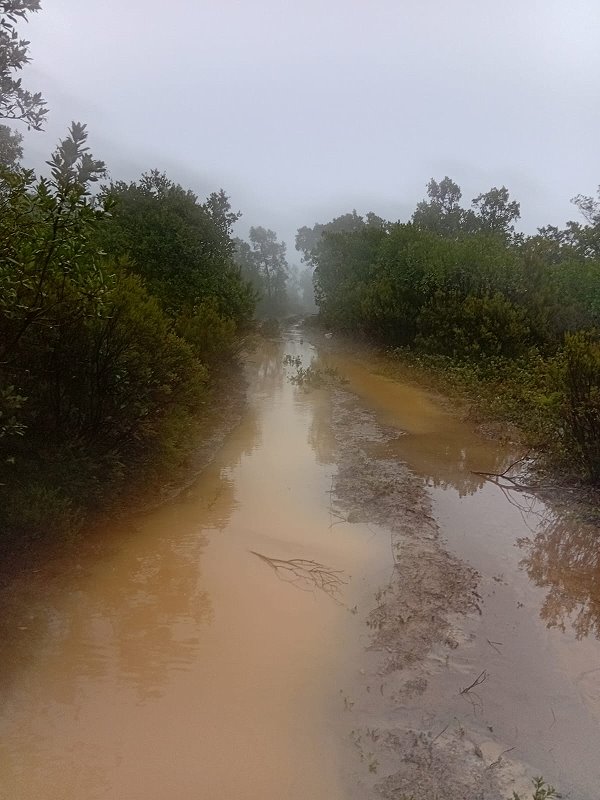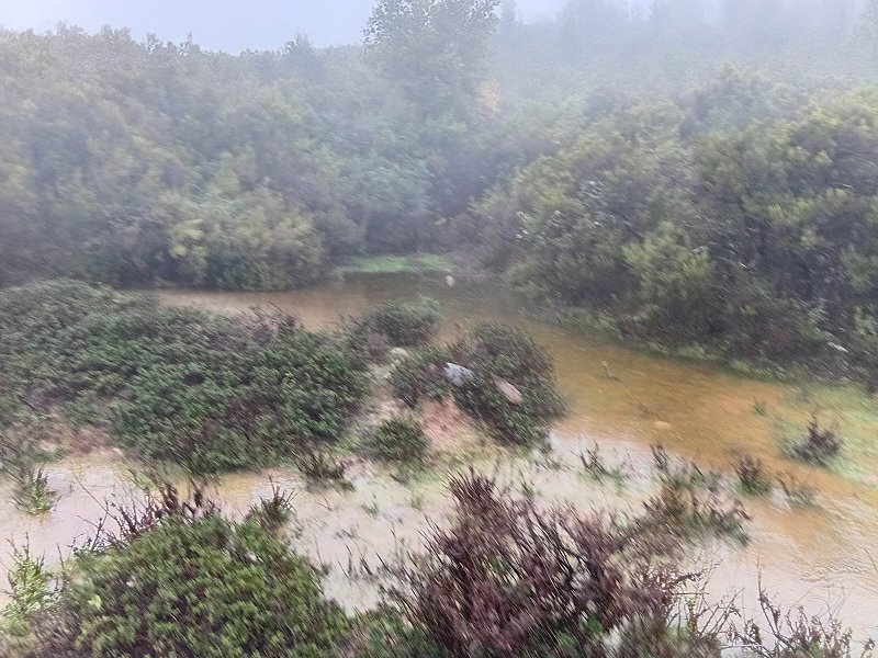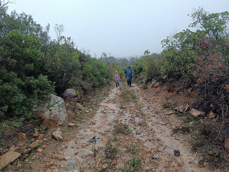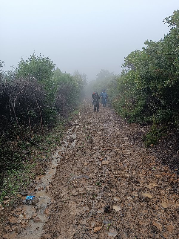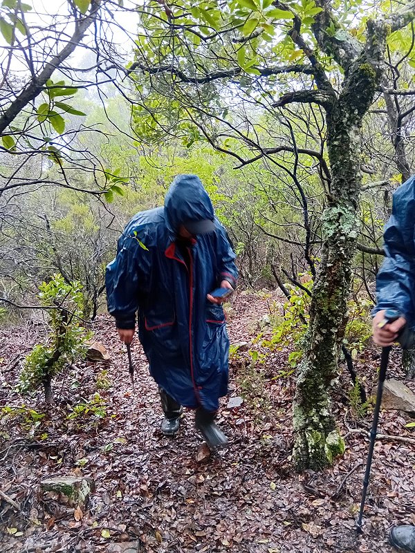 La montée, d’ordinaire modérée, devient un défi technique. La pluie torrentielle réduit la visibilité. La végétation forestière, dense, nous offre un abri précaire mais ne suffit pas à nous protéger du froid. Le sentier se transforme par endroits en ruisseau. Chaque pas nécessite une attention particulière pour éviter de glisser sur les racines et les roches trempées. Malgré la pluie, l’atmosphère est magique : les odeurs d’arbres et de terre mouillée sont intenses, et la forêt prend des teintes sombres et mystérieuses.