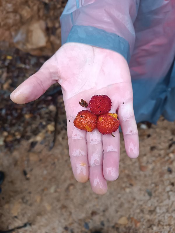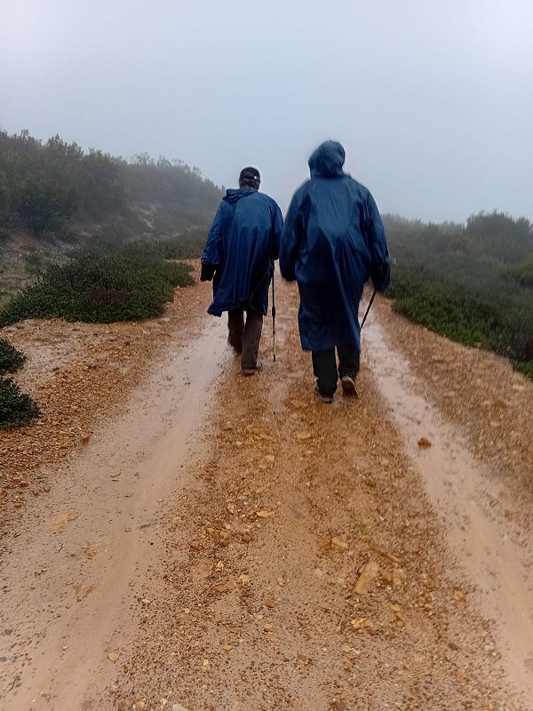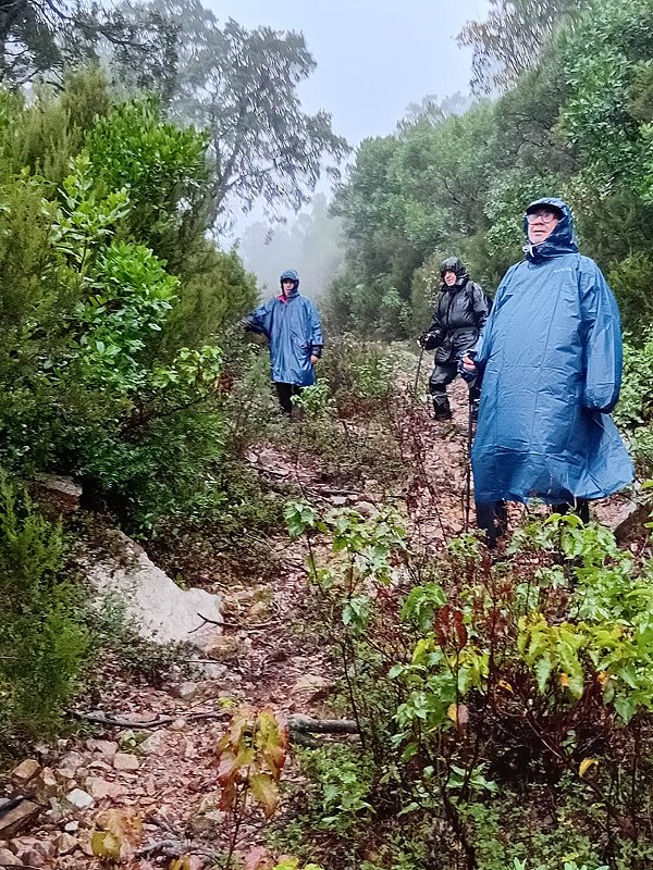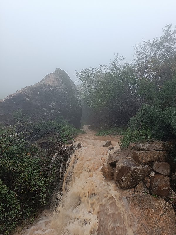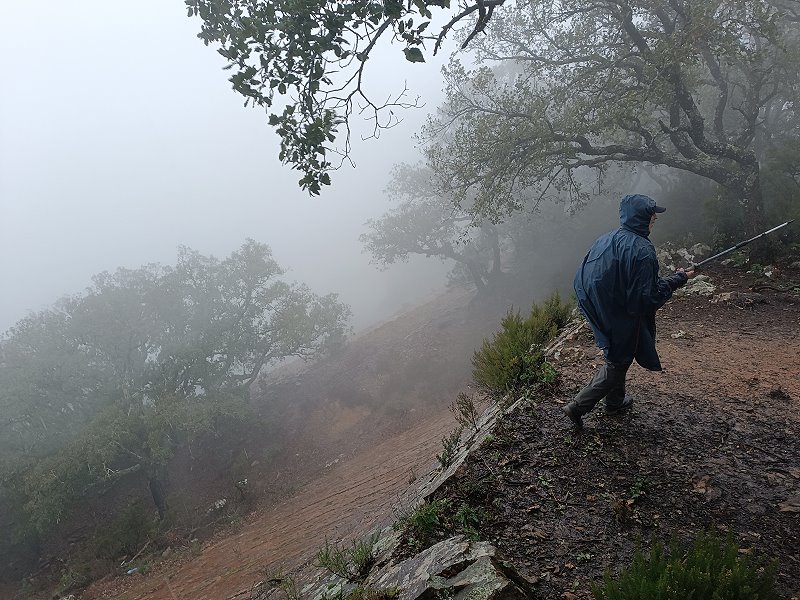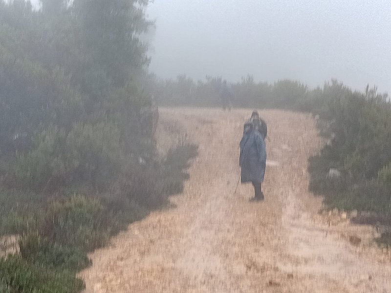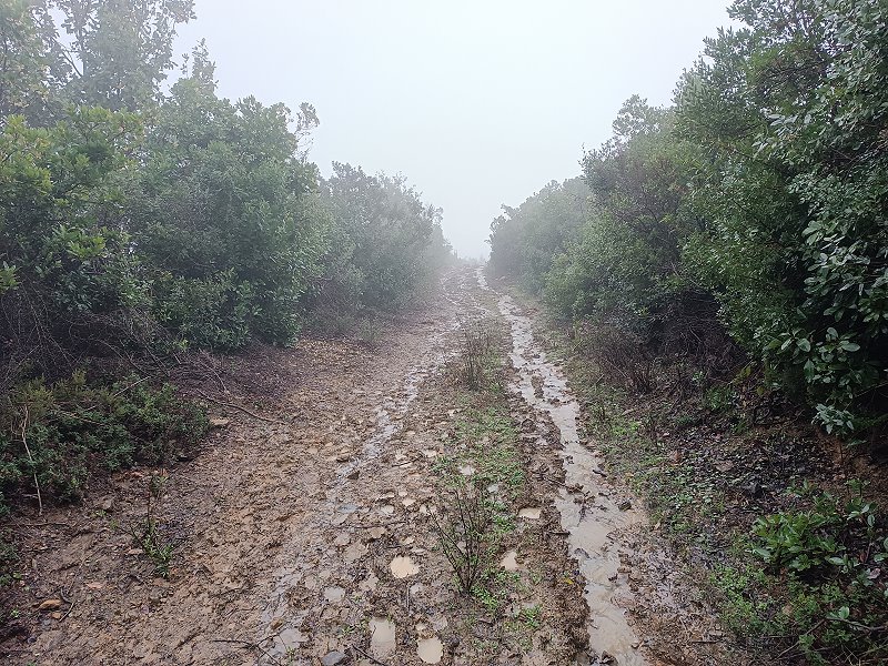 La montée, d’ordinaire modérée, devient un défi technique. La pluie torrentielle réduit la visibilité. La végétation forestière, dense, nous offre un abri précaire mais ne suffit pas à nous protéger du froid. Le sentier se transforme par endroits en ruisseau. Chaque pas nécessite une attention particulière pour éviter de glisser sur les racines et les roches trempées. Malgré la pluie, l’atmosphère est magique : les odeurs d’arbres et de terre mouillée sont intenses, et la forêt prend des teintes sombres et mystérieuses.